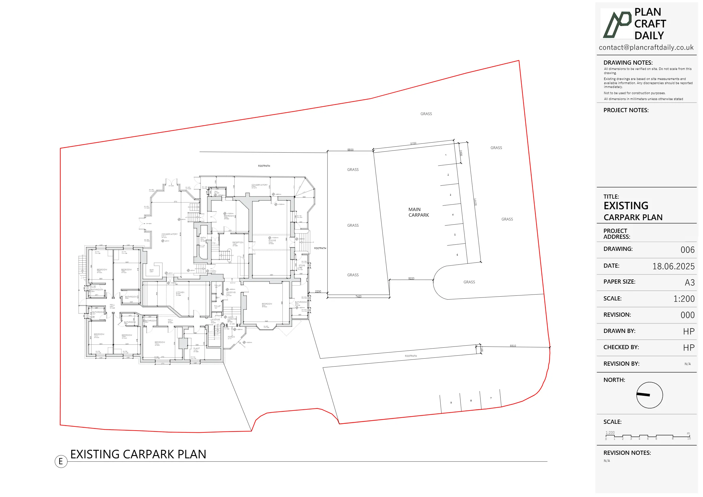 - Car park and garden – at the client’s request, we treated the parking area as a core deliverable, not just a rough outline. The surveyor worked from existing drawings plus on-site checks to capture as much as reasonably possible within the agreed scope.