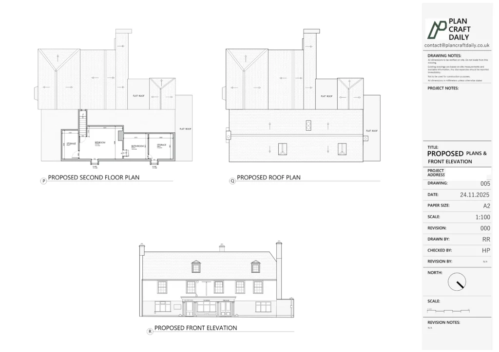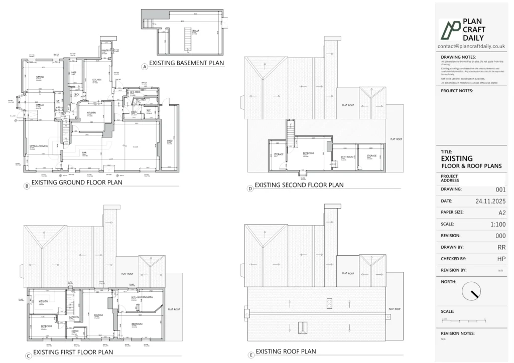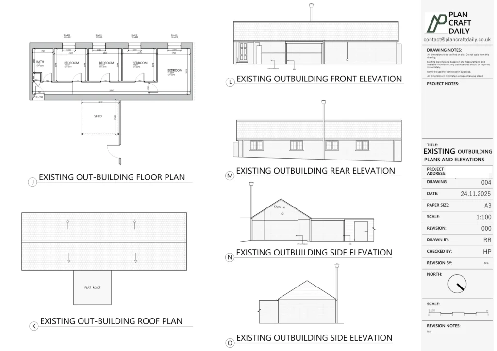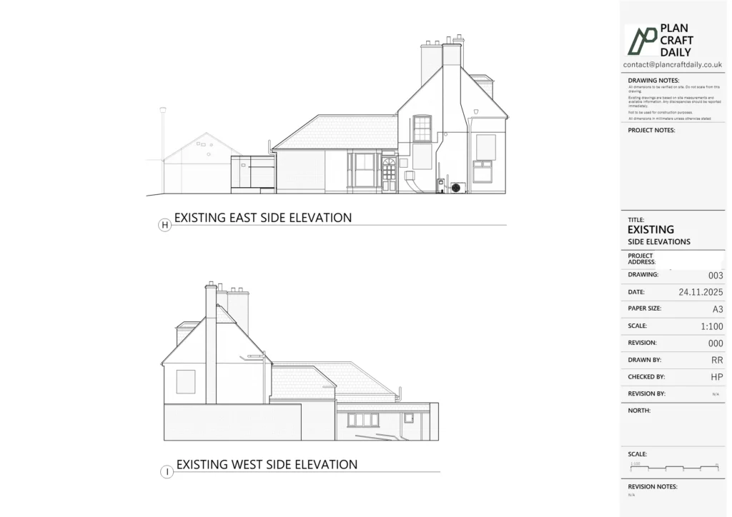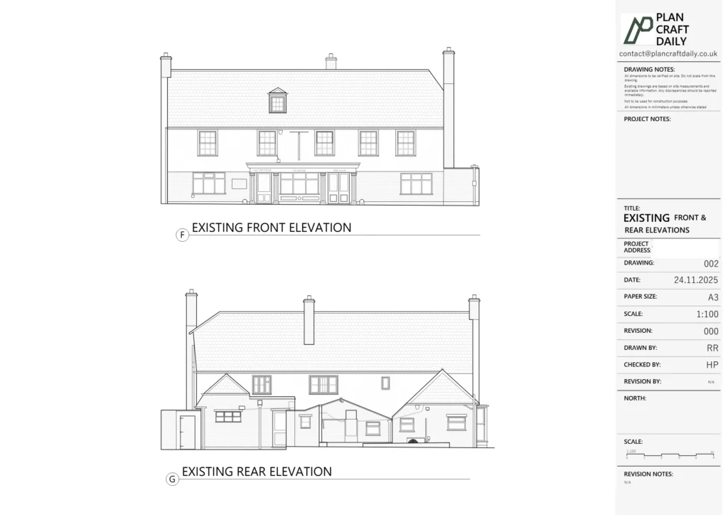 PlanCraftDaily confirmed a survey appointment with a defined arrival window and shared surveyor contact details to ensure smooth site access and coordination. Following the measured visit, we produced the requested existing drawing set based on survey data, maintaining consistency across plans, elevations, section and the site/location plan.