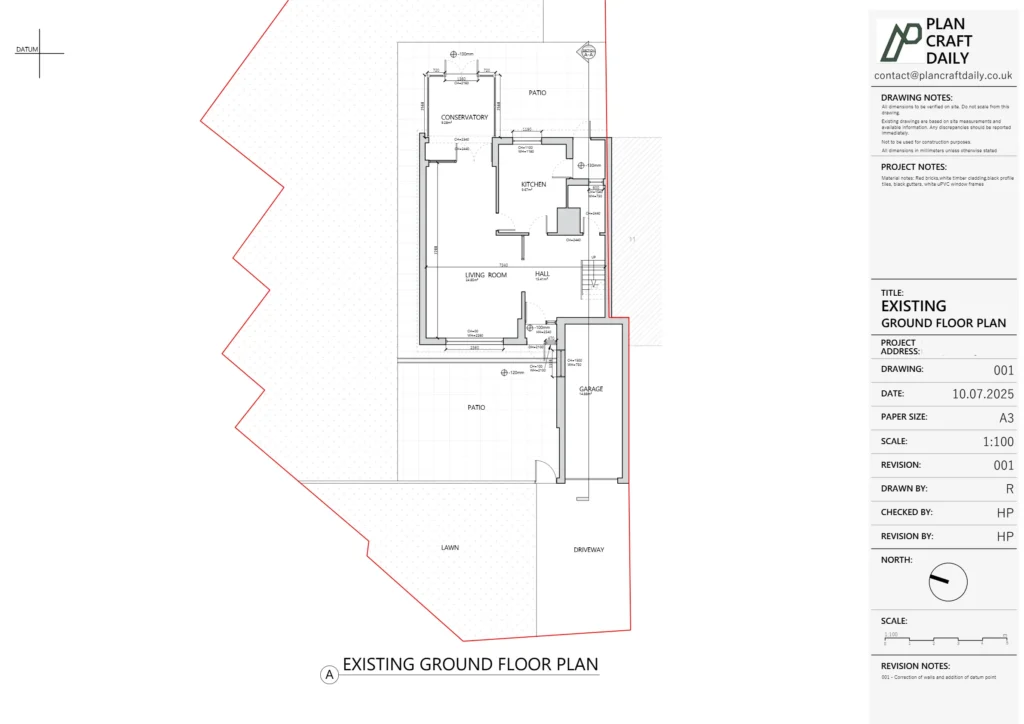 Issued the completed drawing pack in DWG and PDF formats with supporting site photographs. Provided follow-up support as the design team reviewed level alignment and wall positioning, helping ensure the existing drawing information could be used confidently for ongoing design coordination.