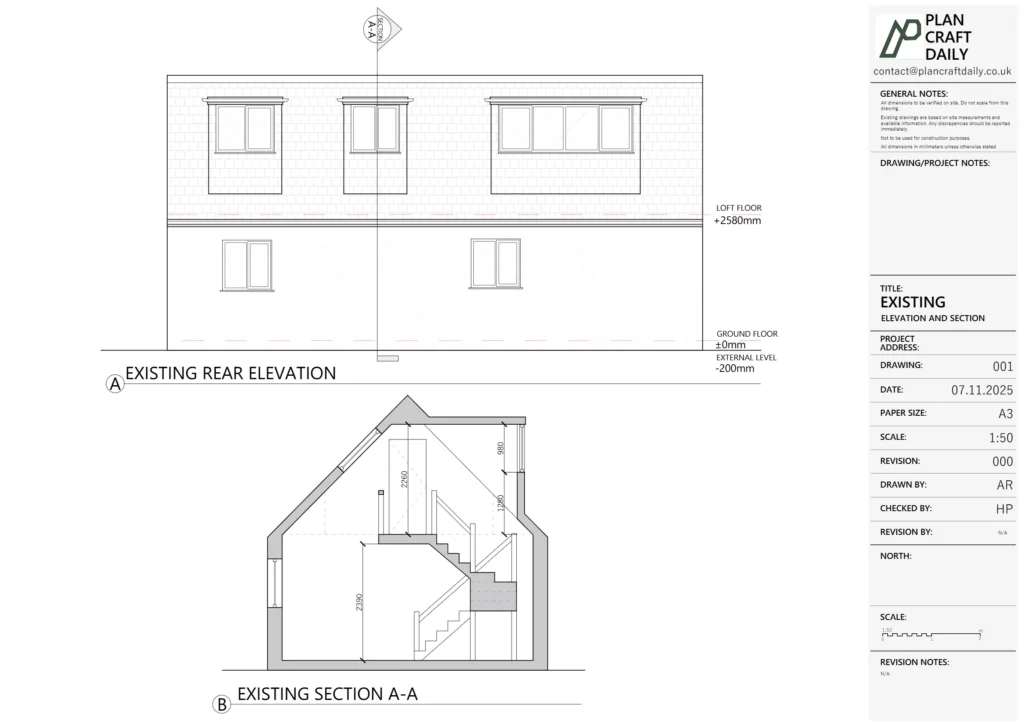Following the site visit, we prepared a draft drawing pack for review to confirm the rear elevation and the full-height section met expectations. Once feedback was cleared, we issued the final drawing set and associated project files, including CAD, PDFs, and site photographs.