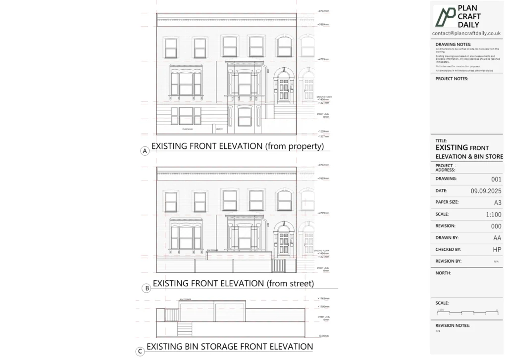 We clarified the exact scope with the design team, confirming that the required outputs were a single front elevation and the elevation towards the front boundary wall, capturing the bin store within the same elevation rather than as a separate sheet. This ensured the survey and drawing production stayed tightly aligned with what the planning submission needed.