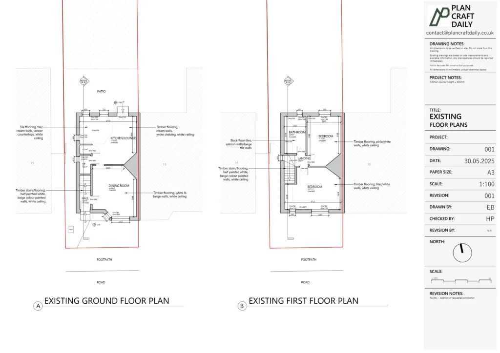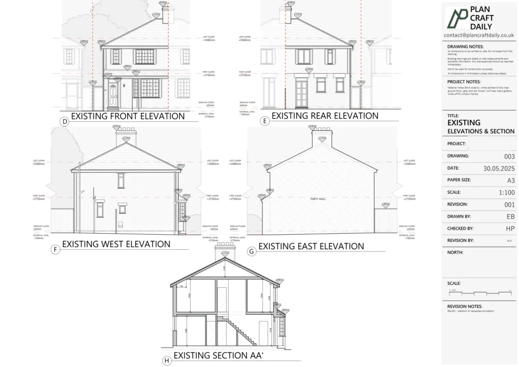 PlanCraftDaily arranged the survey attendance and produced an initial draft drawing pack covering the agreed outputs: existing floor plans, roof plan, elevations and a section. The drafts were issued for review so the client team could quickly begin coordination and return mark-ups against their requirements.