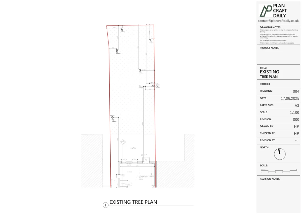 To support the late-stage request for tree information, an additional visit was scheduled with the same surveyor to capture tree positions and trunk circumferences, along with corresponding photographs. This information was then compiled into an updated “Existing Tree Plan” for the client’s use.