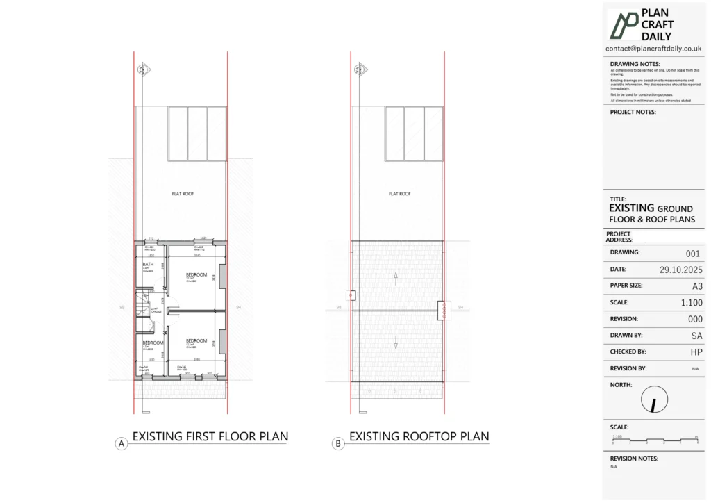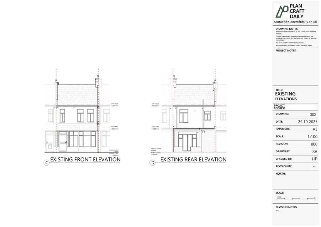 Following the survey, we prepared a draft drawings pack and issued it for review. This allowed the client team to check general layout, roof configuration and the elevation/section information before finalising.