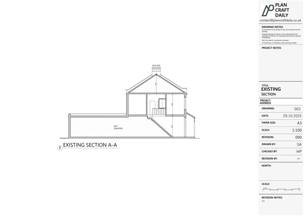 The project required clear coordination around access and timing, with the survey visit arranged to a specific arrival window. We also needed full access to capture the building accurately, ensuring the roof form and key vertical dimensions could be represented correctly across the plans, elevations and section.