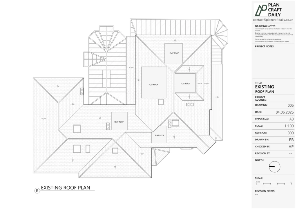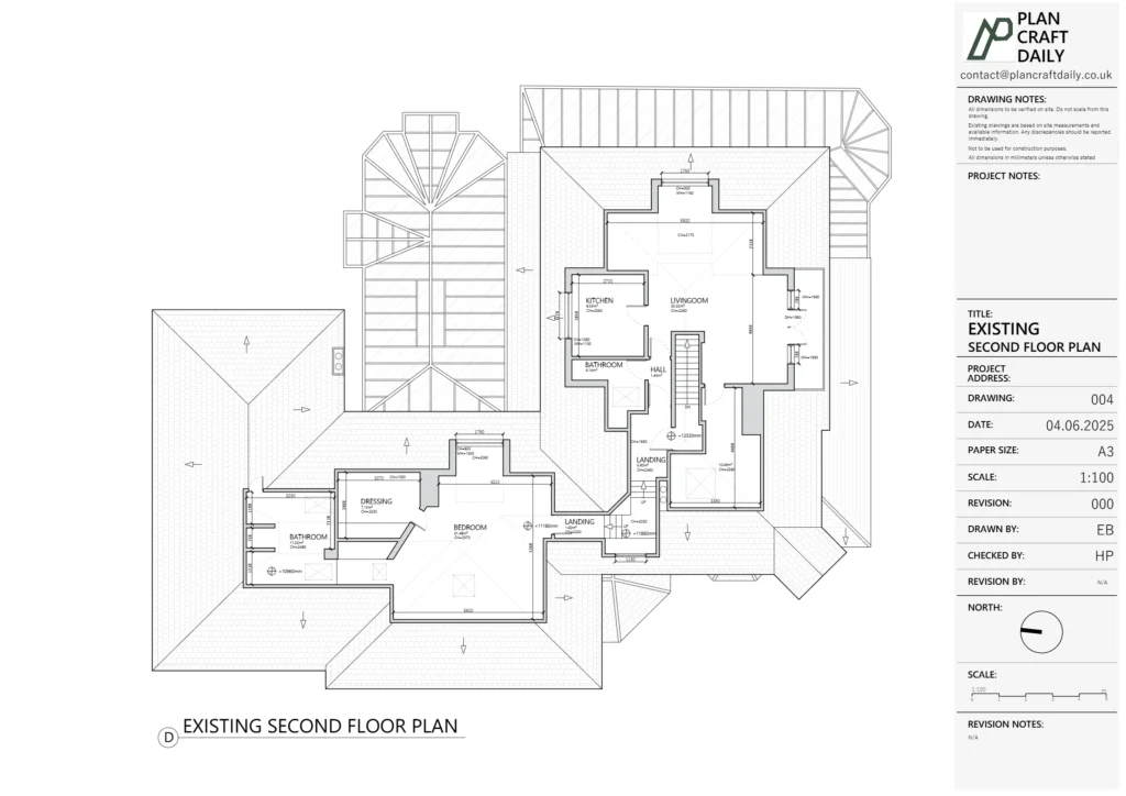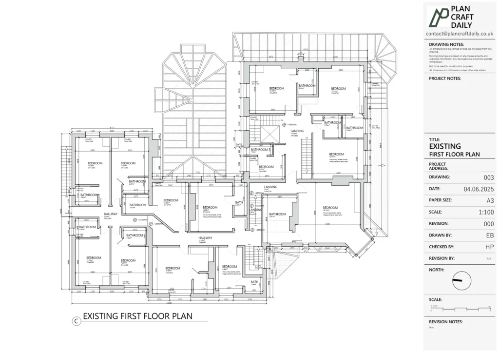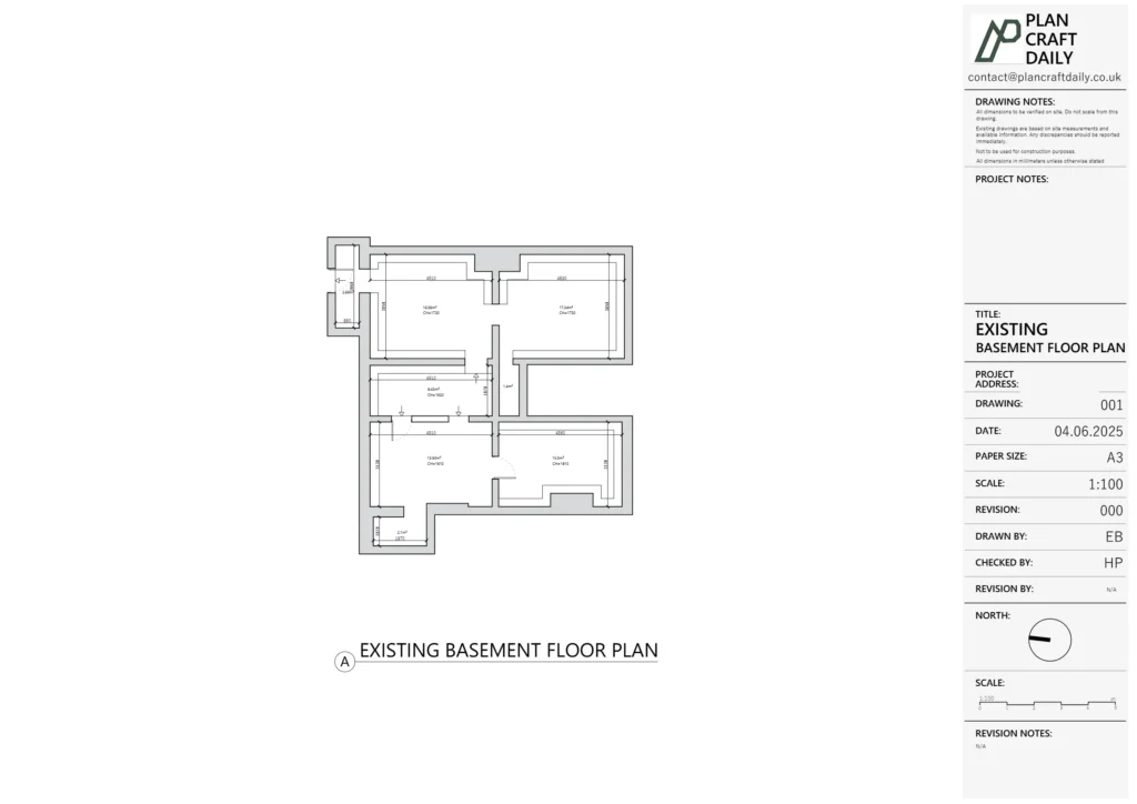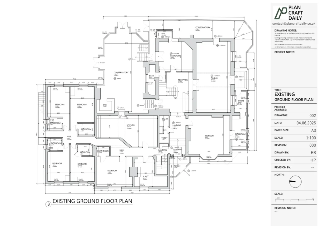 PlanCraftDaily scheduled and completed the measured survey, then produced a draft drawing pack for review. The drawings were prepared for architectural use and set out to include both internal and external dimensions in line with the reference sample provided by the client team.