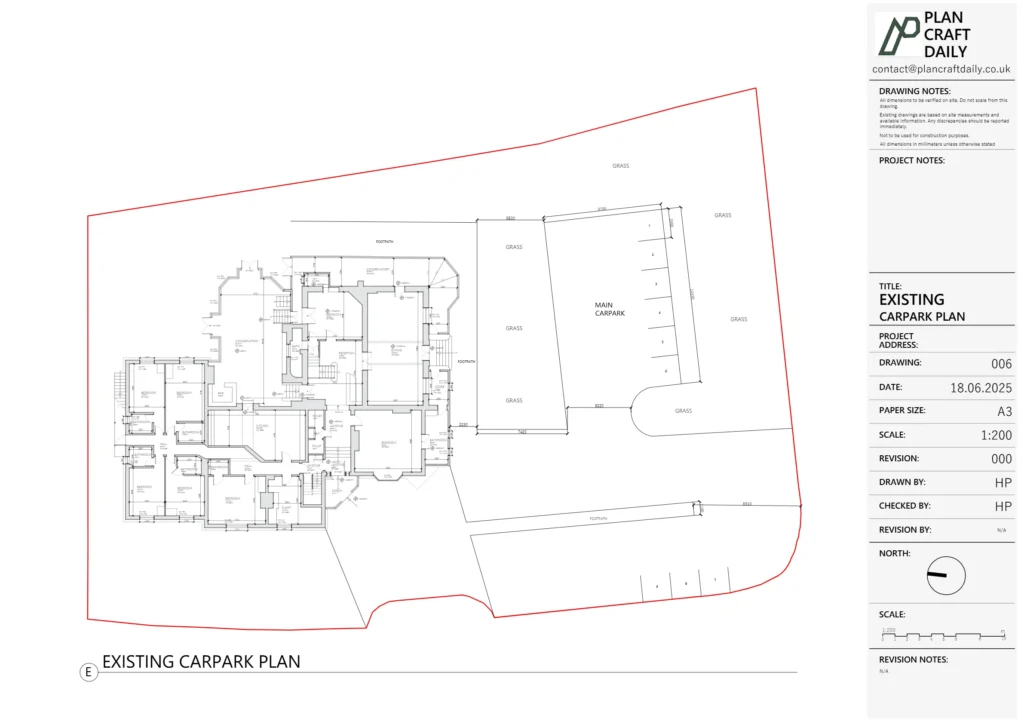 The client needed a measured building survey and a coordinated set of existing drawings for a hotel to support the next stage of design and redevelopment. The team required internal and external dimensions presented clearly, including the parking areas, so the architect could proceed with proposed works.