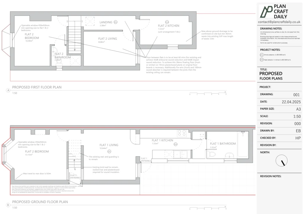 The client needed proposed drawings for a first-floor extension scheme to first-floor flats in Sittingbourne, covering a front porch concept plus side and rear extension elements. The information came through as a set of practical design notes, with multiple constraints to coordinate across elevations and layouts.
