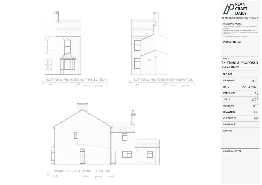 We reviewed the proposal notes and translated them into a structured drawing approach, ensuring the scheme could be read clearly across the key parts of the build: front porch, side extension and rear extension. Dimensions and placement were clarified early (including overall depths, widths, and boundary clearance) so the layout could be coordinated consistently.