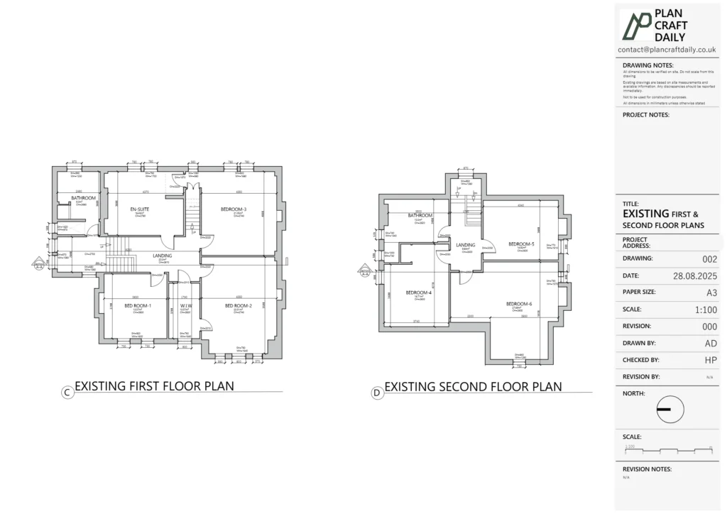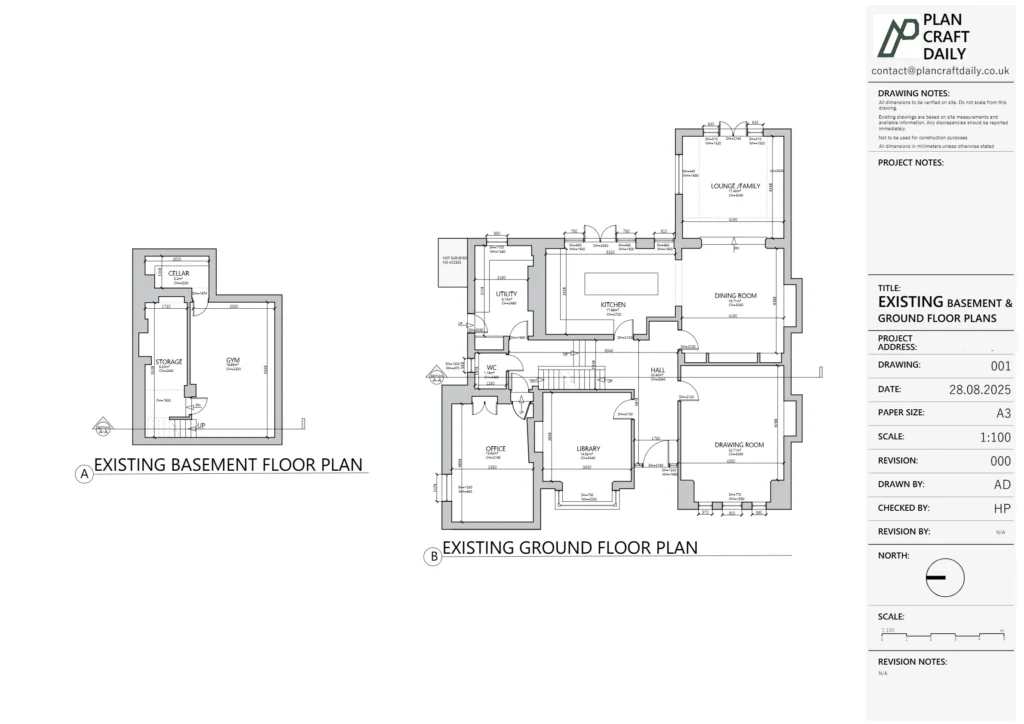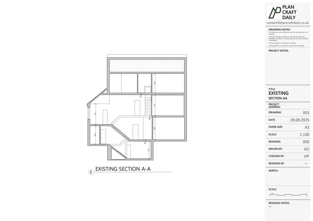 The client needed a full measured site survey and a coordinated set of existing (as-built) drawings for a residential property in Twickenham, including GA plans of all floors with lighting and heating shown, a main section to confirm floor thicknesses, and elevations of each room. They also requested room photographs captured in elevation and preferred a CAD layout that arranged elevations “360” around the plan to support their workflow.