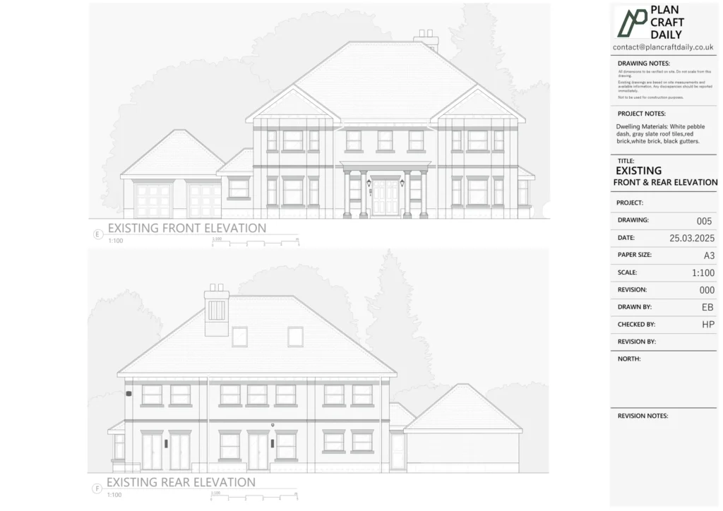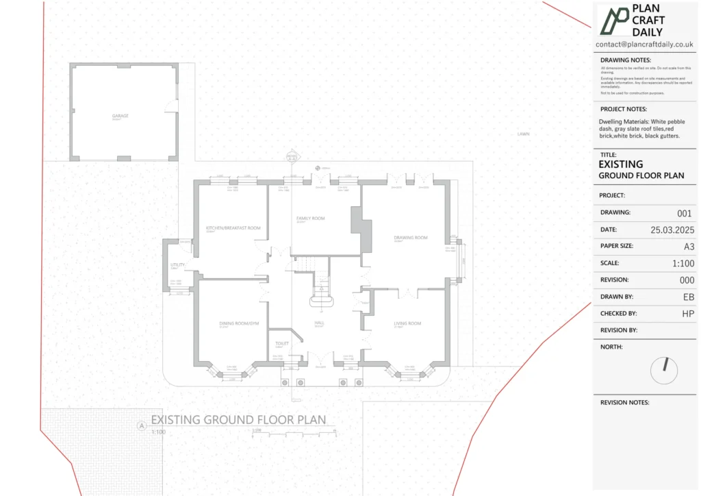 Because the work related to internal layout changes, the baseline information needed to be detailed enough to avoid on-site assumptions later. In addition to the general measured survey, the client requested key dimensional information such as floor-to-ceiling heights, roof ridge heights, garage measurements, and precise door/window sizing. Site features like manhole positions, wall thicknesses, and any critical measurements also needed to be recorded for a complete as-built picture.