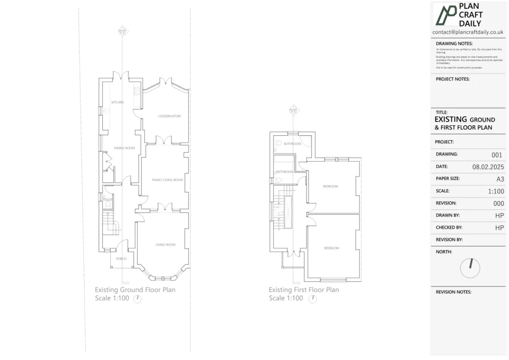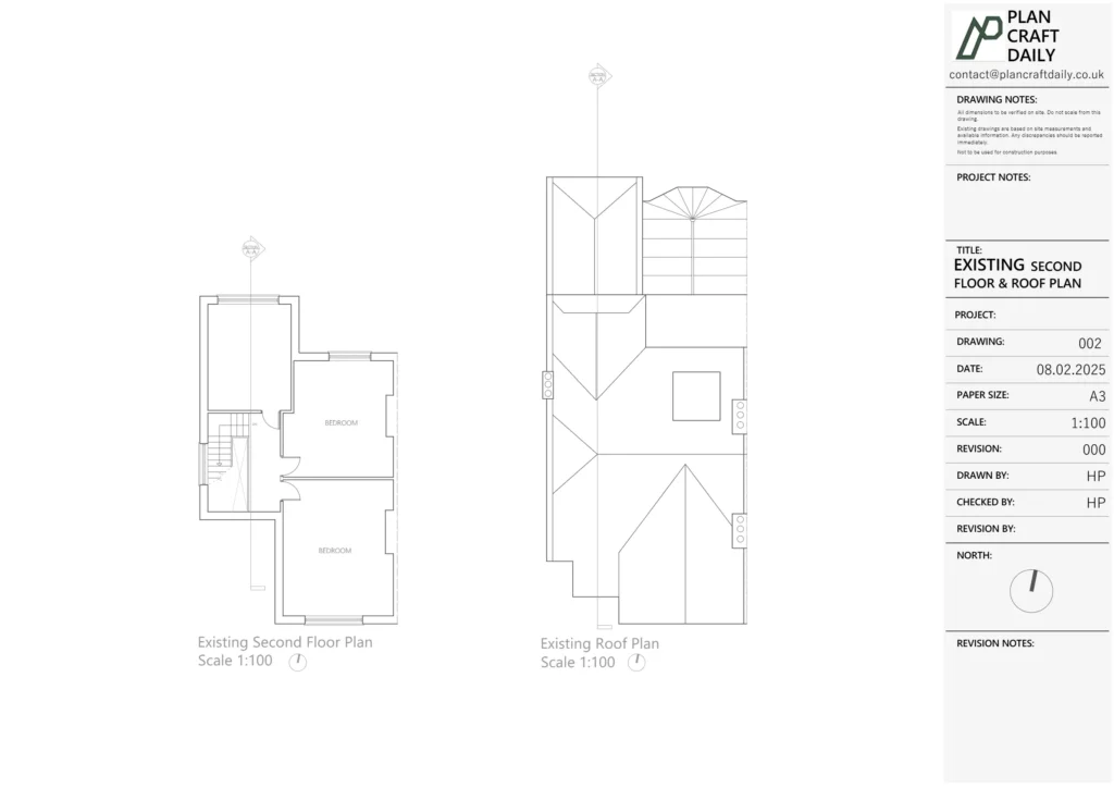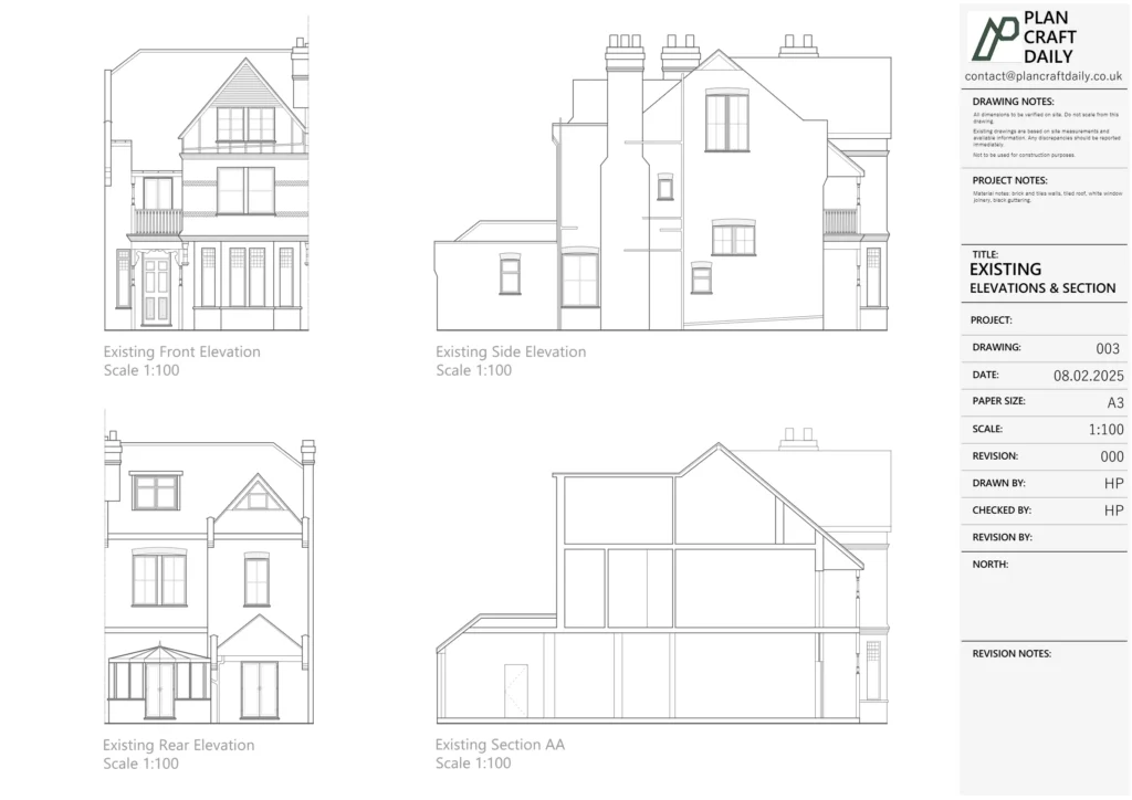 We confirmed the required existing drawing set (plans, roof plan, elevations and a section) and captured the client’s presentation preferences to ensure the output matched UK conventions. Access requirements and preferred attendance times were noted early to support smooth site coordination.