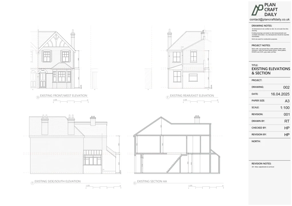 The project also had scheduling constraints, with the survey arranged as an afternoon visit and the client requesting proactive arrival updates on the day. Following initial delivery, the client reported issues within the drawing pack—specifically an incorrect roof plan and a missing bay window on a side elevation—creating a clear need for careful revision control and a corrected re-issue.